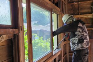 通路が狭い場所で、重機・車両が搬入できなかったため、手作業解体およびリヤカー等を使って廃材搬出を行わせていただきました。